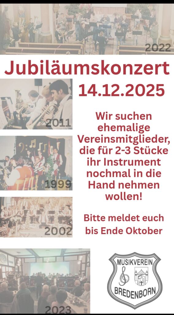 Der Musikverein führt traditionell zum dritten Advent ein weihnachtliches Konzert auf. Im Jubiläumsjahr – der Musikverein ist mittlerweile 100 Jahre alt – soll das Konzert auch von ehemaligen Vereinsmitgliedern, die ihr Instrument nochmal in die Hand nehmen wollen, gestaltet werden. Habt ihr Lust, wieder mitzuspielen? Kennt ihr jemanden, der wieder mitspielen möchte? Bitte meldet euch bis Ende Oktober beim Vorstand oder bei den aktiven Musikerinnen und Musikern – ihr seid herzlich willkommen!