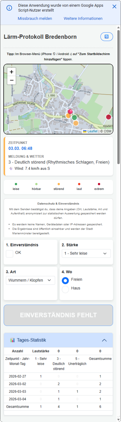 Um euch das zu vereinfachen und die Beschwerden zu bündeln, haben wir eine kleine Web-App erstellt, die genau diese Daten erfasst und speichert (funktioniert nur im Umkreis von Bredenborn).