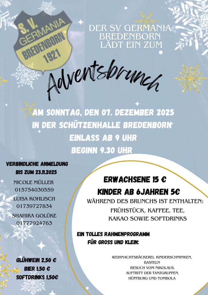 Der SV Germania Bredenborn lädt ein zum Adventsbrunch am 7. Dezember 2025 und bietet dabei mit Weihnachtsbäckerei, Kinderschminken, Nikolausbesuch, Auftritt der Tanzgruppen, Hüpfburg und Tombola wieder ein tolles Rahmenprogramm für groß und klein.